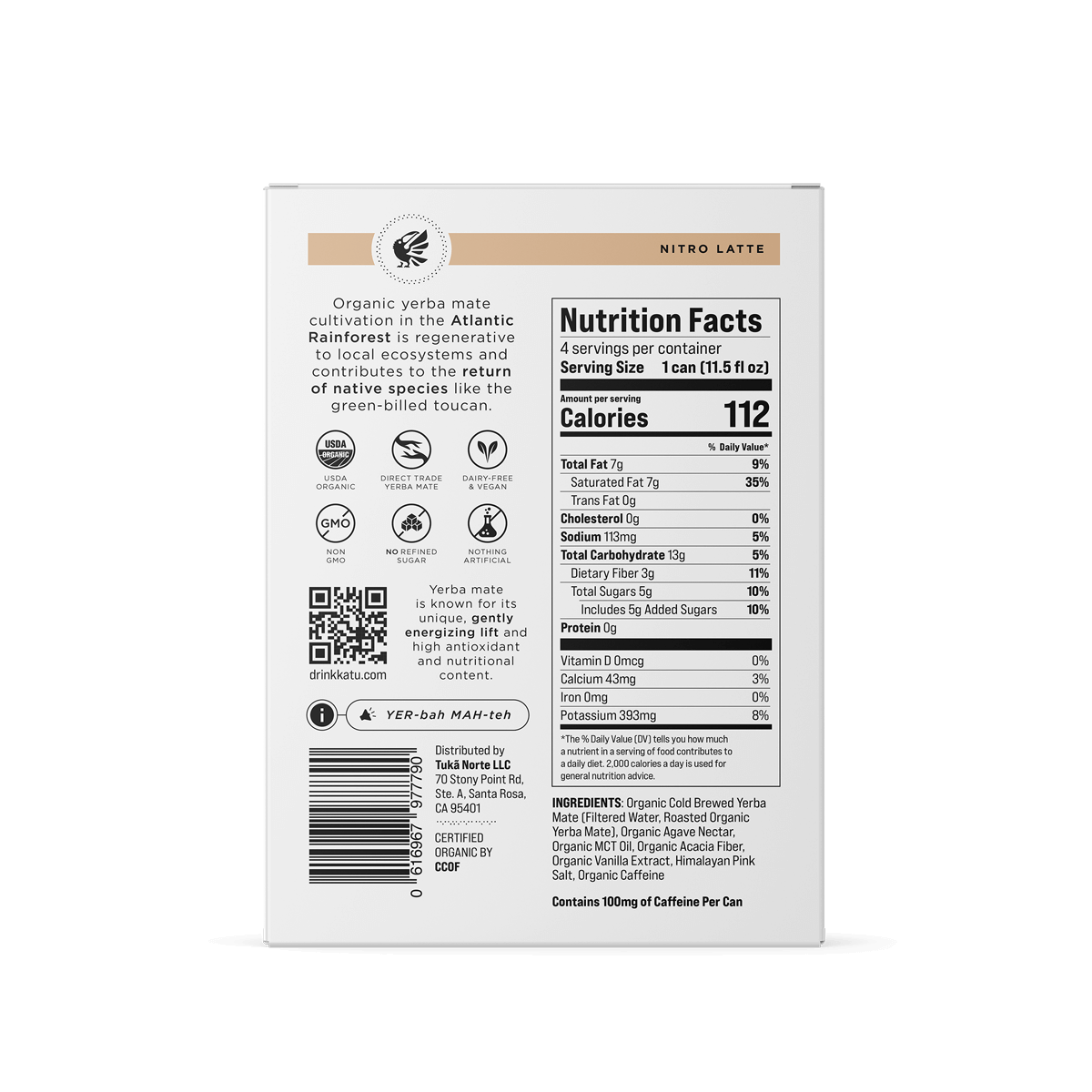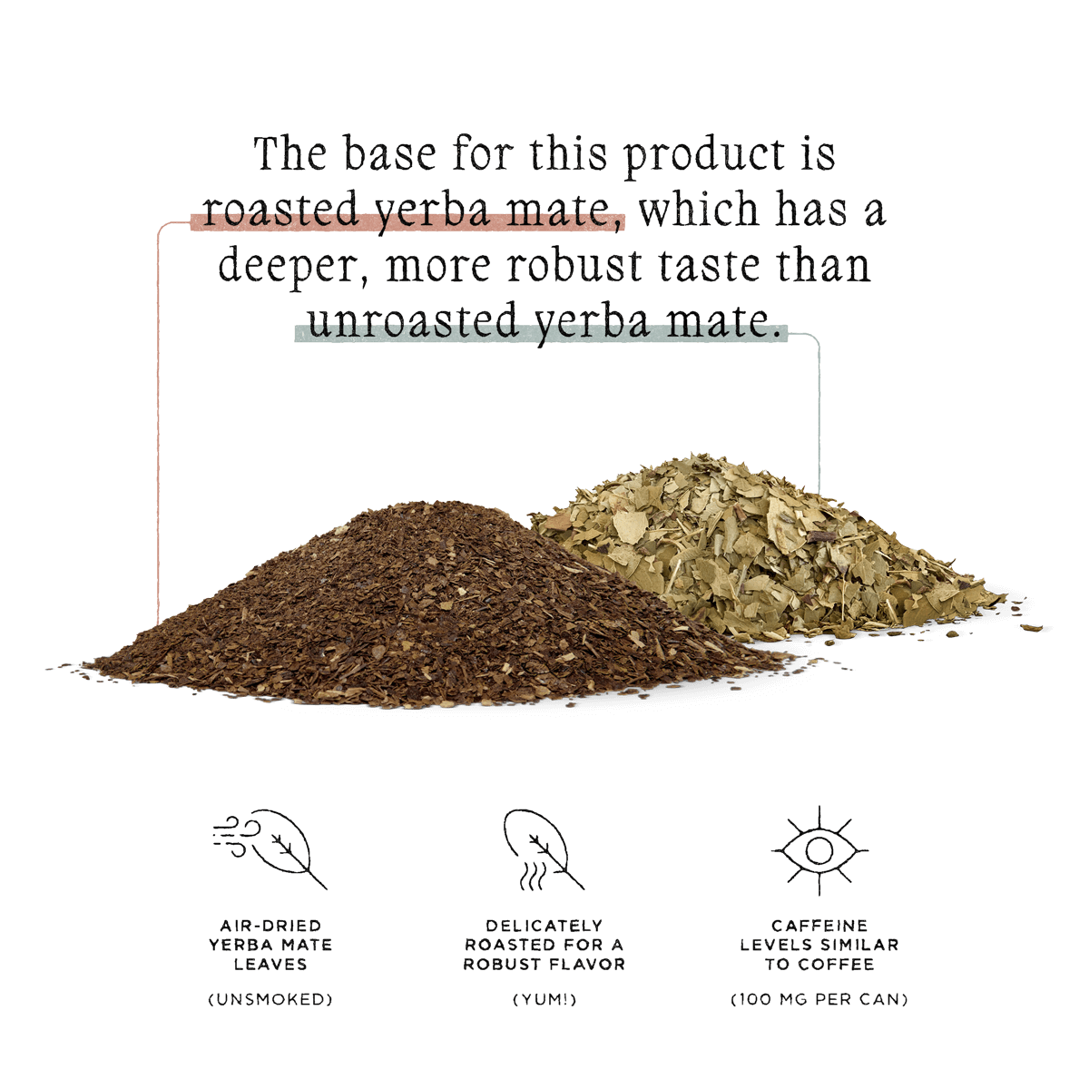 Organic cold brewed yerba mate (filtered water, roasted organic yerba mate), organic gum acacia, organic agave syrup, organic coconut MCT oil, organic vanilla extract, Himalayan pink salt, organic caffeine